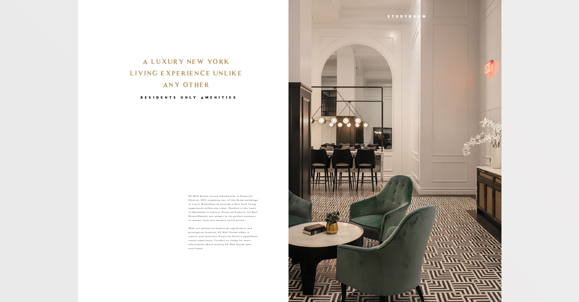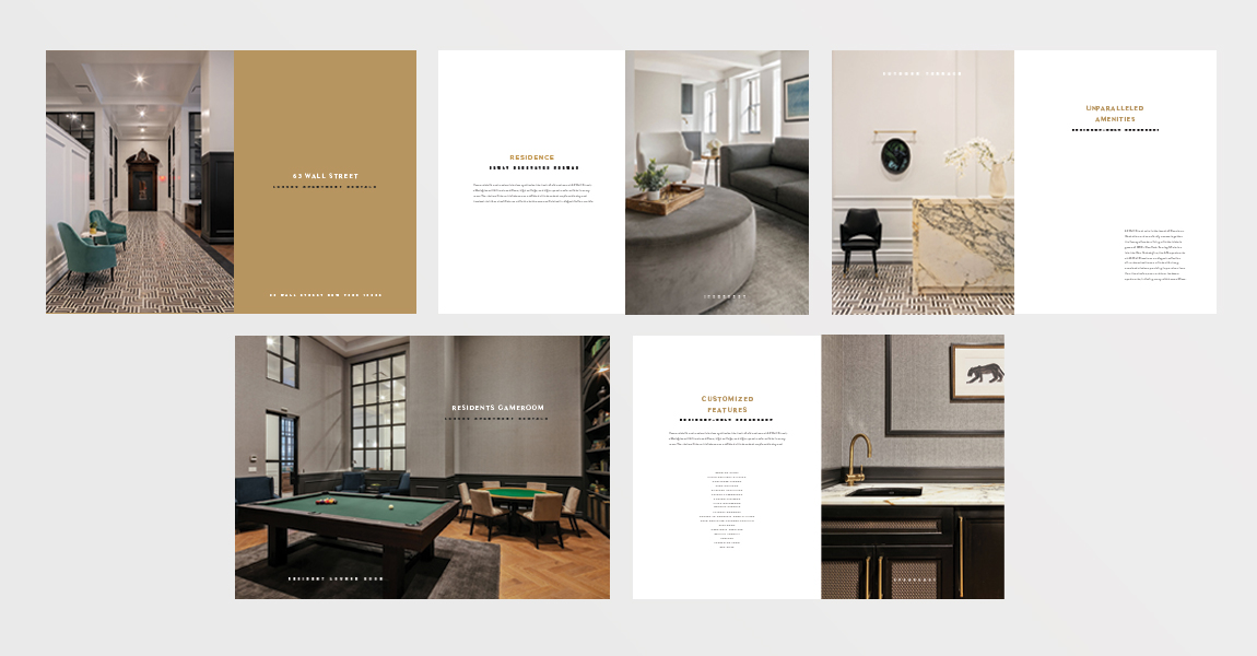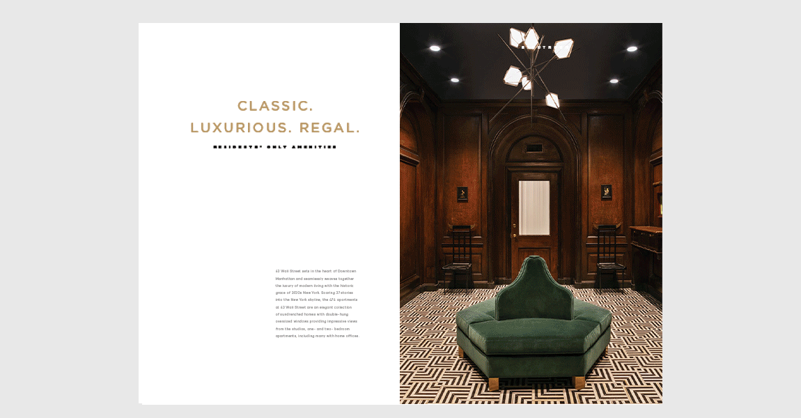 360˚ marketing campaign for 63 Wall St, NYC. Designs preserve the integrity of the building's rich history. Creative lead for logo, brochure and website design.